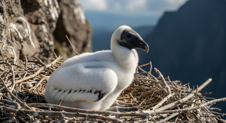 A young, fluffy white Andean condor chick sits patiently in its nest made of twigs on a high cliff edge. The image captures a rare and intimate moment of this majestic bird's early life in its natural mountain habitat.