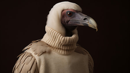 a white-dressed bird, captured in a contemporary realist portrait style, wearing a sweater in dark pink and dark beige. this hyperrealistic sculpture embodies elements of junglecore, drawing inspiration from the dusseldorf school of photography, prehistoric art, and the art of the ivory coast. ai generated