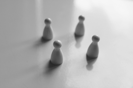 Minimal workspace with copy space and ceramic vase decorations on white table and white wall background