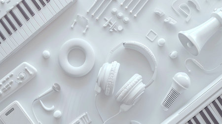 Flat assembly composition with photographic production equipment on plain white background, top view