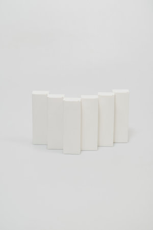 handmade soap bar with small white flowers on a light gray background top view, monochrome photo