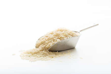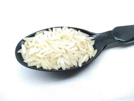 Cuisine and Food, Uncooked Brown and White Jasmine Long Rice, Basmati Rice or Thai Jasmine Rice on Measuring Spoon. High in Vitamin B3, B6, B1 and B5.