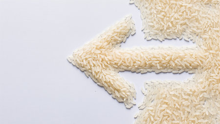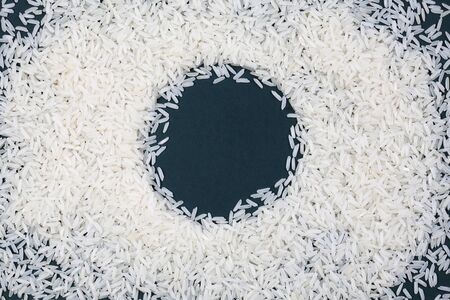 Close-up of high-quality raw white rice grains spread on a white surface with a central empty space for text. Perfect for food, cooking, and health-related designs