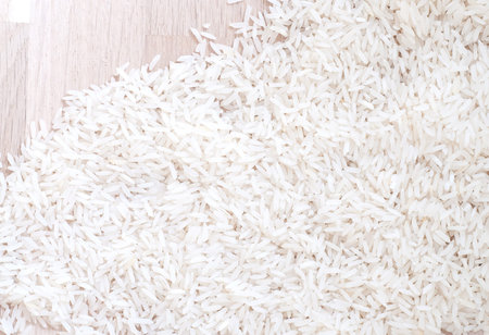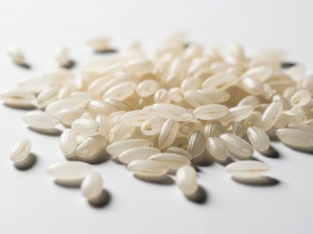 A detailed view of uncooked white rice grains forming a scattered pile on a plain surface. Ideal for culinary projects, food styling, and cooking inspiration.