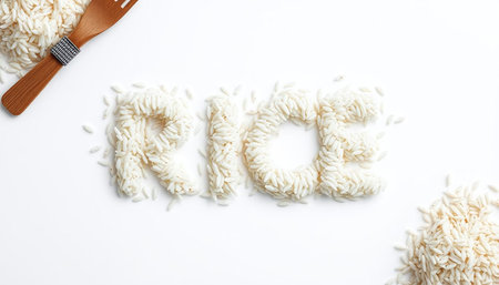 Raw rice arranged in the word RICE with wooden fork on a plain white background. AI Generated.
