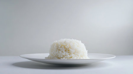 A basic yet elegant presentation of steamed white rice on a white dish, with a white background, highlighting the simplicity and purity of the meal.