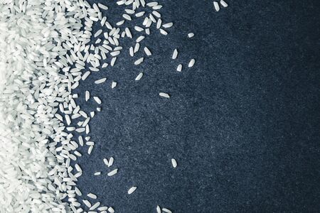 A fresh arrangement of white rice grains spills across a minimalist gray surface, providing a perfect backdrop for cooking or food-related projects.