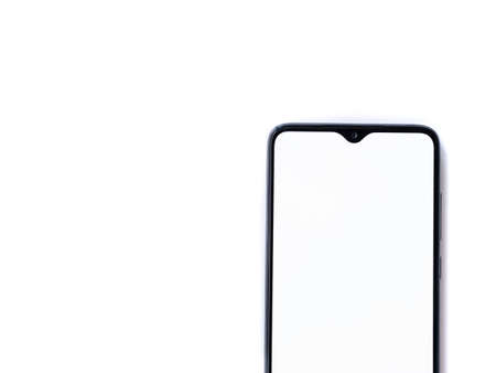 Black mobile smartphone mockup lies on the surface with blank screen isolated on white background. Top view flat lay with copy space, cut in the middle.