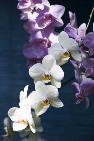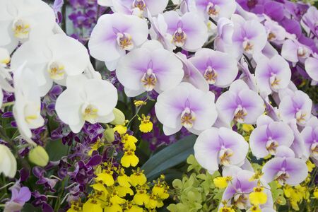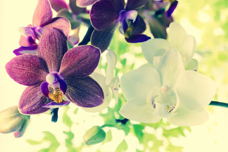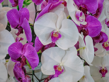 Close up of beautiful purple and white phalaenopsis orchid flowers