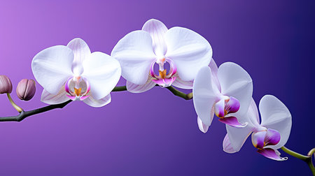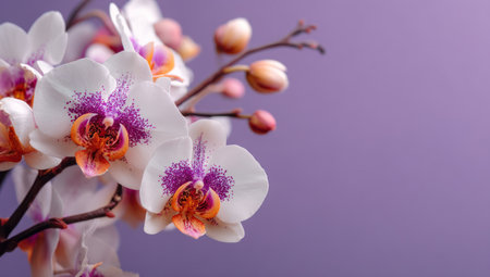 An image showcases exquisite orchid blossoms with delicate white petals, highlighted by vibrant purple and orange centers. The close-up composition emphasizes the flowers' textures and details. The background is a soft purple. This image is suitable for various commercial uses, including decorative purposes and editorial content.