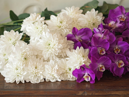 A beautiful and elegant floral arrangement featuring a bouquet of delicate white chrysanthemums and vibrant purple orchids displayed on a wooden table