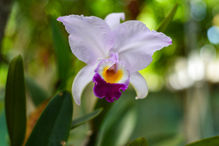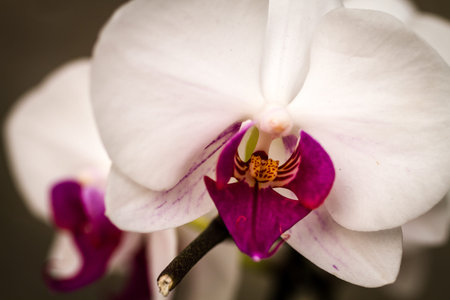 Close-up of delicate white orchid with vibrant purple and orange accents on its petals. Intricate details of flower orchid create elegant and exotic atmosphere. Perfect for floral and nature themes