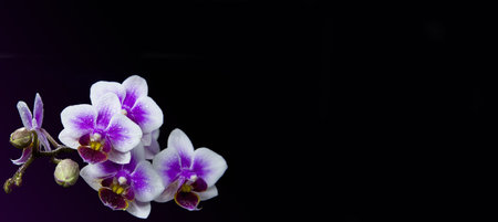pink orchids with droplets of water and copy space isolated on black. Floristic colorful abstract spa background