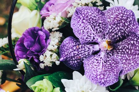 A bouquet of flowers in purple tones with a tiger orchid in the center. Close view
