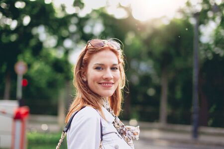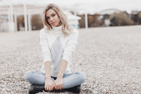 Gorgeous young girl with blond long straight hair in the white knitted sweater stands against the backdrop of a city park and poses, smiles, enjoys the nature in the sunshine behind her.