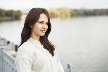 Young brunette woman in a white woolen sweater on autumn street background
