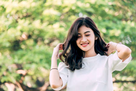 Portrait of Beautiful young woman with summer green park background.