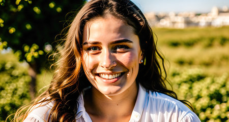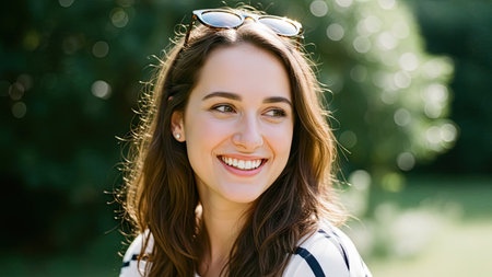 A young woman is shown smiling with sunglasses resting on her head. The image displays natural sunlight with a blurred green background. It exhibits a shallow depth of field, with soft textures and warm tones. Suitable for various uses including lifestyle, portraiture, and editorial content.