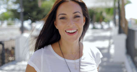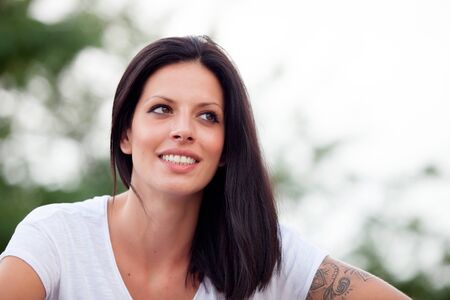 Young beautiful woman with brunette hair and perfect smile posing in park