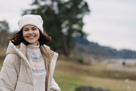 Winter outdoor smiling portrait of a woman wearing a jacket and beanie, enjoying a crisp day in a wide landscape with open space, soft daylight and calm nature.