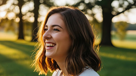 A woman is shown smiling radiantly outdoors. The image showcases soft sunlight filtering through trees, creating a warm and natural setting. The composition features a shallow depth of field, ideal for various commercial applications, emphasizing joy and positivity, in a natural environment.