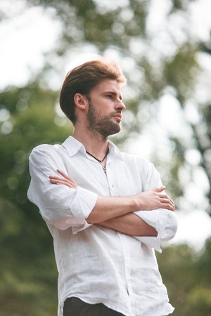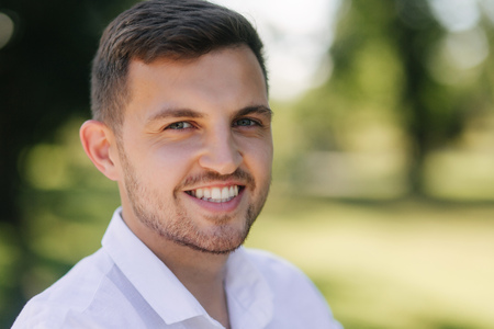 Portrait of a young handsome man with short hair, wearing white t-shirt, outdoors