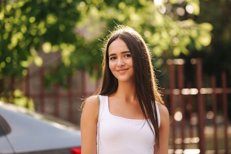 Portrait of young beautiful woman in white t-shirt posing in bright sunlight and laughing at camera on background of street.