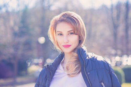 Young beautiful blonde caucasian woman walks alone enjoying the spring weather. Beautiful girl, outdoor portrait. Young attractive woman, spring outdoor portrait. Charming cheerful woman