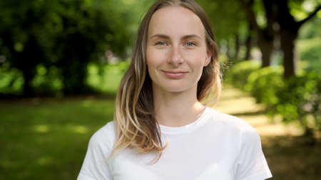 Outdoor close-up portrait of a beautiful young woman smiling broadly and looking to the camera, posing against nature background in the park.