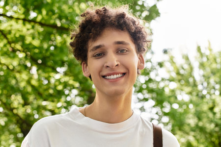 A young man with curly hair relaxes in a vibrant summer park, enjoying nature.