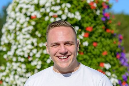 Happy friendly attractive young man with a welcoming beaming smile standing outdoors in front of summer flowers in the garden in a close up head and shoulders portrait
