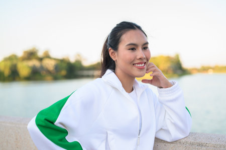 Happy young Asian woman in sporty activewear outdoors. Casual lifestyle portrait with cheerful expression, natural light, and positive energy for wellness, vitality, and fitness themes.