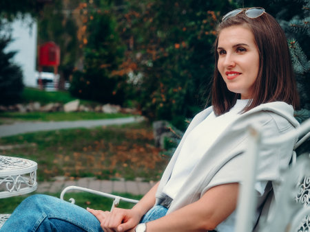 Beautiful Caucasian woman sits on park bench and looks away. Portrait of girl 30 years old..
