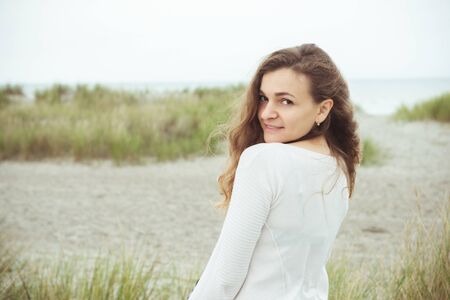 Portrait of pretty young woman posing on the Baltic sea beach in autumn