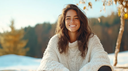 A Cozy woman smiling in winter landscape, enjoying serene atmosphere