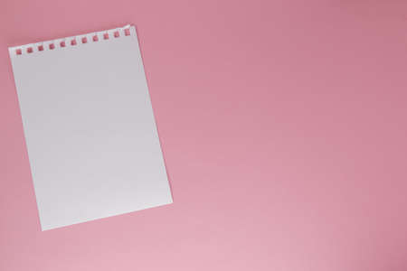 One white sheet of paper torn from a notebook, on a pink background with a copy of the space.
