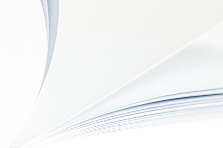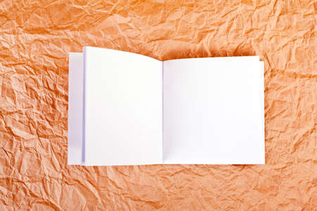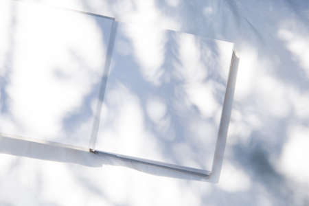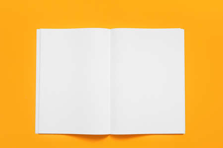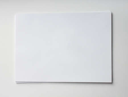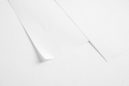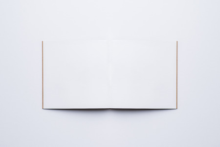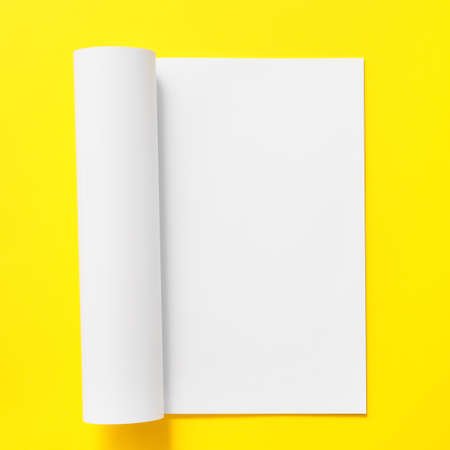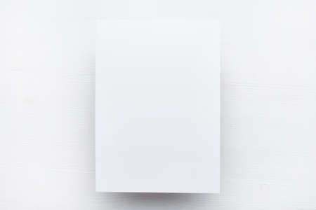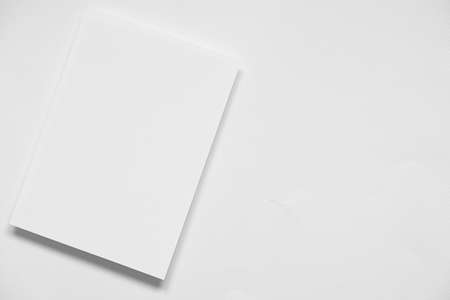 top view of blank clean white vertical mock up brochure with soft shadow on blank white paper background.