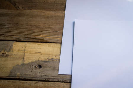 Top view of a blank sheet of white paper lying on a textured wooden rustic desk with dark edges of the image.
