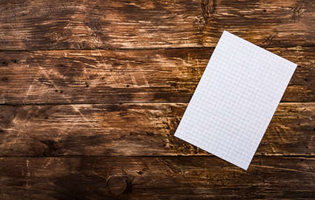 Old grunge rustic dark scratched wood texture background with piece of squared paper for notes. . Text space, empty template.