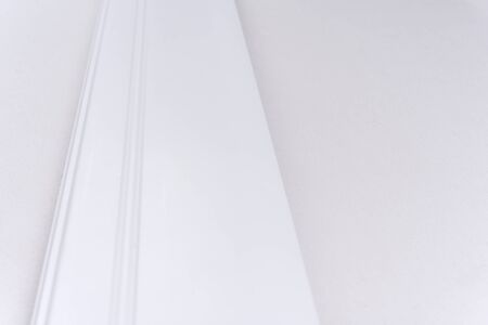 White canvas hanging on light blue wooden wall. Corner of blank canvas stretched on stretcher bar, side view, closeup