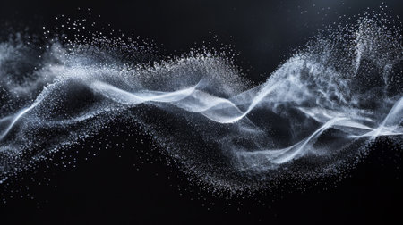 A long, wavy line of white particles is suspended in the air. Concept of movement and energy, as if the particles are dancing or swirling around. Scene is dynamic and lively