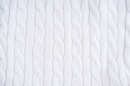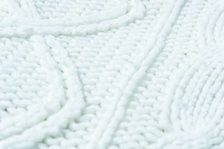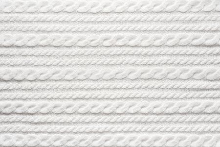 Abstract knitting fabric background. White texture background from merino knitted blanket, scandinavian minimalism backdrop with copy space, top view.