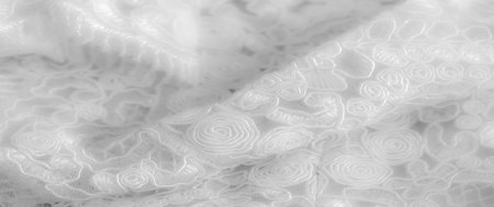 Blur of soft white lace fabric with swirling patterns and floral details, emphasizing the refined texture and intricate craftsmanship in an elegant fashion.