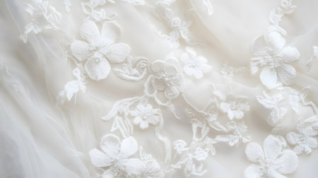 Close up view of lacework on a white wedding dress highlighting elegant floral designs, creating a romantic atmosphere for special ceremonies