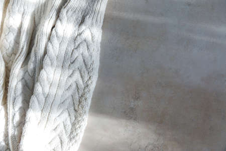 White Wool Knitted Clothes on Stone Marble Table Beautiful Sunlight Shine Background Top View