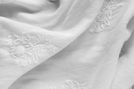 Pure white draped linen embroidered cloth closeup as a background