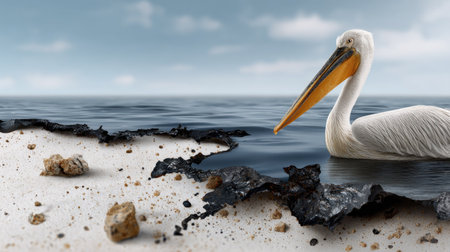 A solitary pelican stands at a polluted shoreline, highlighting the urgent issue of environmental degradation. The stark contrast of oil on water underscores the impact on marine life and coastal ecosystems.