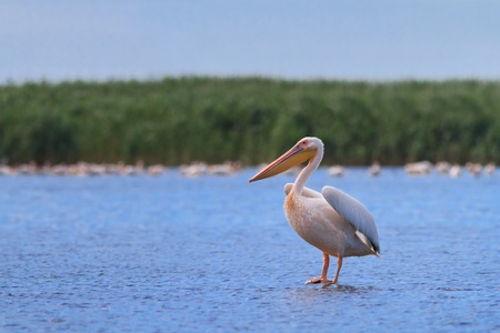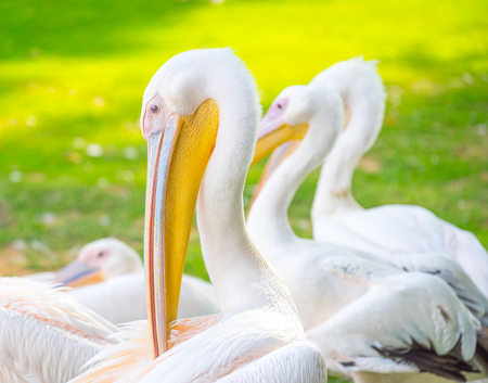 View of a great white pelican also known as the eastern white pelican, a bird in the pelican family. It breeds from southeastern Europe through Asia and Africa, in swamps and shallow lakes