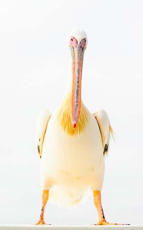 Big beautiful white pelican isolated on white. Funny cute zoo bird pelican. Pelican - large water bird that eat fish