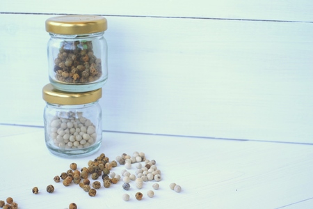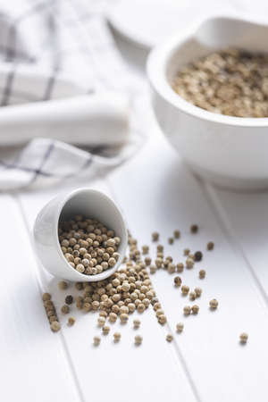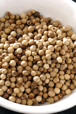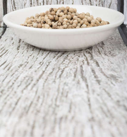 Whole pepper spice. White peppercorn grain in bowl on white table.